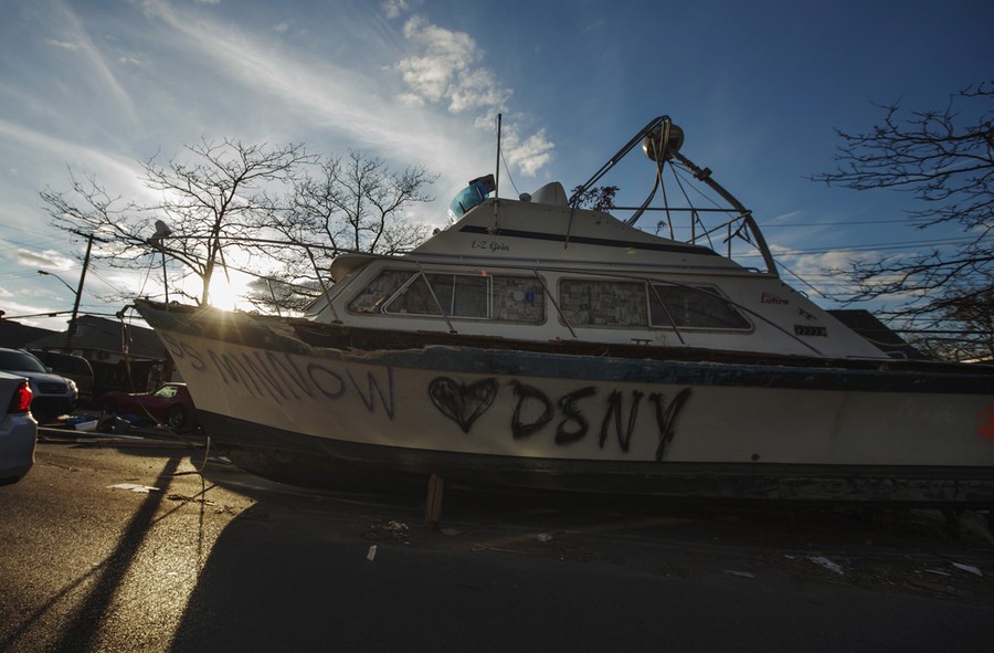 A message of support for the New York Department of Sanitation is painted on the side of a stranded boat on Cross Bay Boulevard in Queens, on November 4, 2012.#