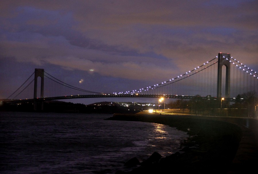 The half of the Verrazano Narrows Bridge attached to Brooklyn is lit while the half attached to Staten Island is dark, in New York, on November 2, 2012.#