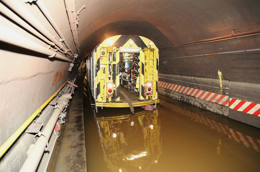 New York City Transit employees use a pump train, to remove water from the Cranberry Street Tunnel, which carries the A and C trains between Brooklyn and Manhattan underneath the East River.#