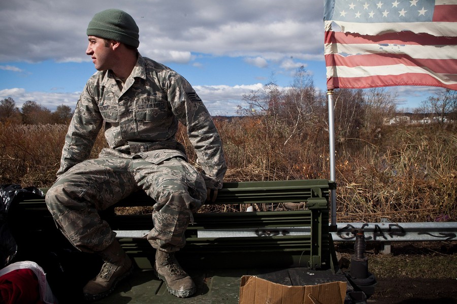 Members of the US Air Force National Guard patrol the Midland Beach neighborhood of Staten Island, looking for those in need of food, water or clothing, on November 3, 2012 in New York City.#