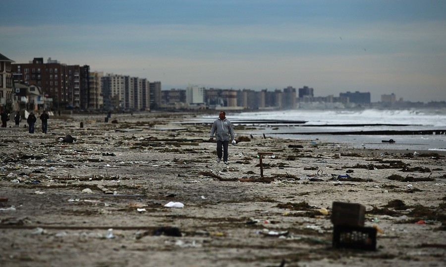 A man walks along the beach in the heavily damaged Rockaway neighborhood, in Queens where a large section of the iconic boardwalk was washed away, on November 2, 2012.#