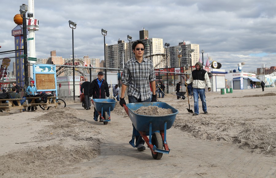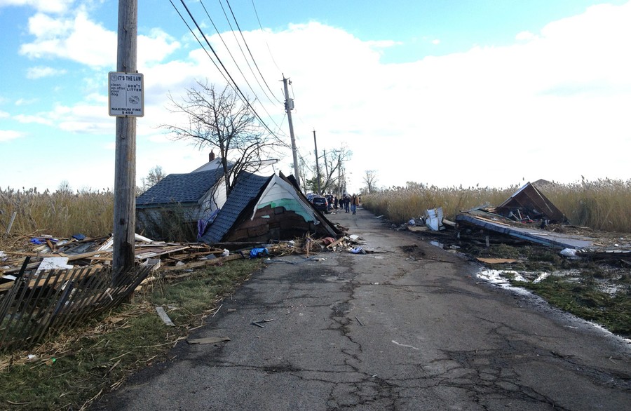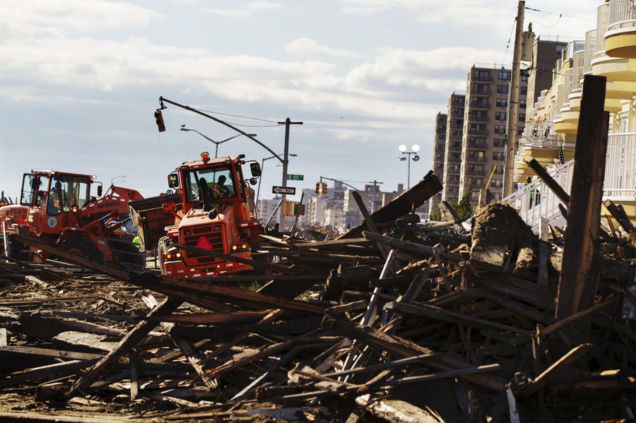 Department of Sanitation trucks work to clean up destroyed sections of boardwalk ripped apart by superstorm Sandy along Shore Front Parkway in the Rockaways area of Queens, on November 4, 2012.#