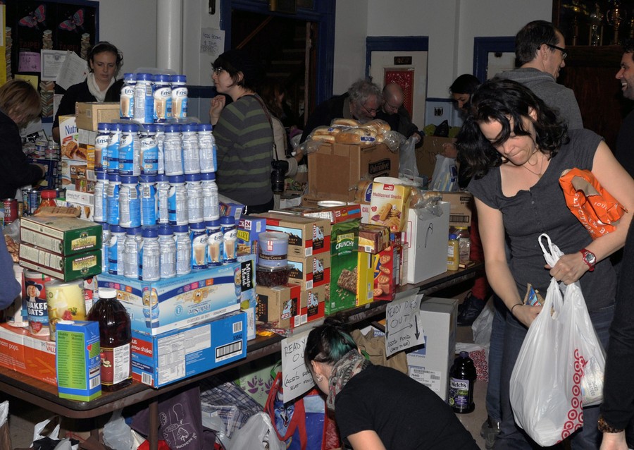 The scene at Occupy Wall Street's Hurricane Sandy relief drop off center at St. Jacobi's church in Sunset Park Brooklyn, on the evening of November 1, 2012. Volunteers prepared food and water supplies for flood devastated Rockaway and Staten island amid a steady stream of donors. Original here.#