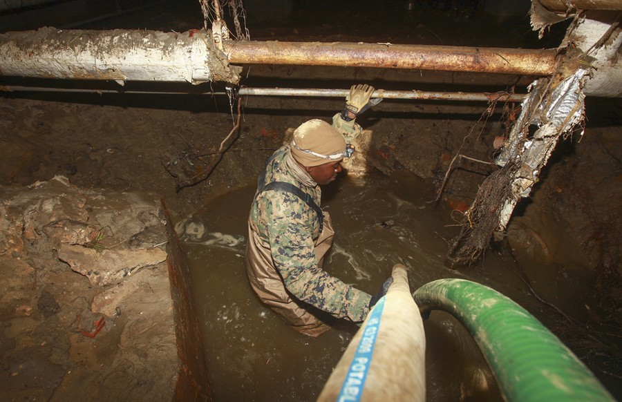 Cpl. Smith Thenor, a native of Fort Lauderdale, Florida, a combat engineer with a detachment of 8th Engineer Support Battalion, 2nd Marine Logistics Group based out of Camp Lejeune, North Carolina, organizes hoses to pump water out of the basement of an apartment building in Far Rockaway, New York, on November 4. The detatchment of Marines from 8th ESB volunteered to help aid the victims of the cities that were effected by Hurricane Sandy.#