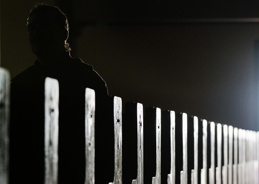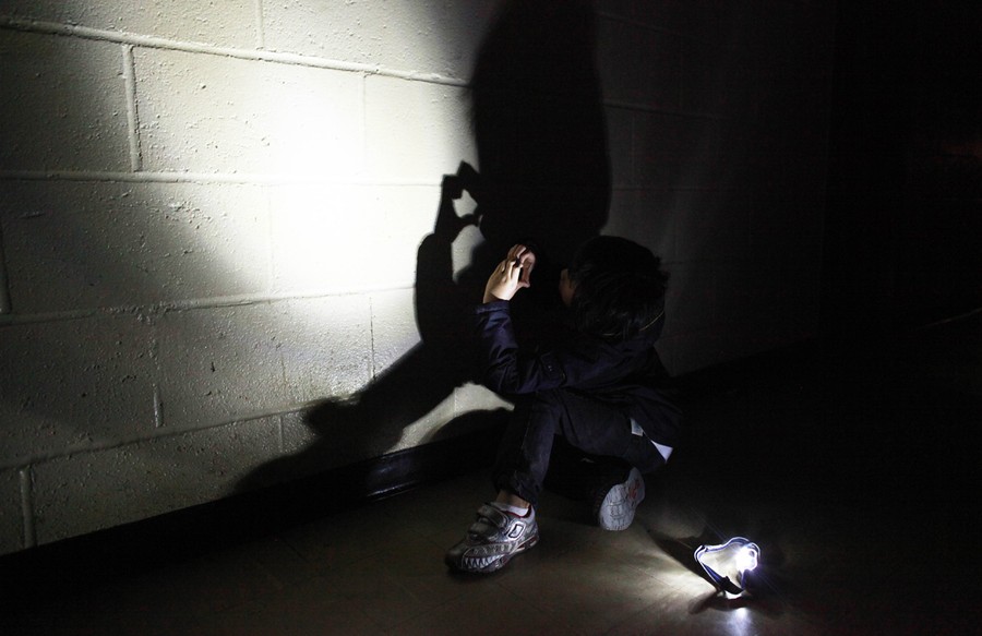 A child makes shadow puppets with head lamps while volunteers go door to door in the Meltzer Towers Housing Project giving out food and water to elderly and disabled residents, on November 2, 2012 in New York City. The electricity, heat and water are out in all New York public housing buildings.#