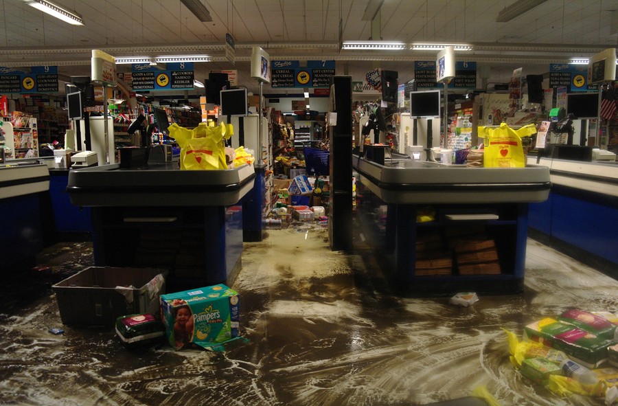 Eddie Liu uses a broom to clean up mud and water from extensive flooding in a laundromat due to superstorm Sandy in Coney Island, on November 2, 2012.#