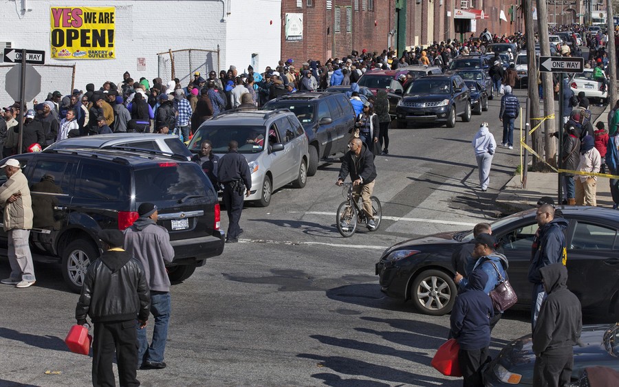 People in cars and on foot line up for free gasoline in the Jamaica neighborhood of Queens, on November 3, 2012. Trucks provided by the U.S. Department of Defense at the direction of President Barack Obama at this site and others were deployed in coordination with the New York National Guard at the direction of the governor.#