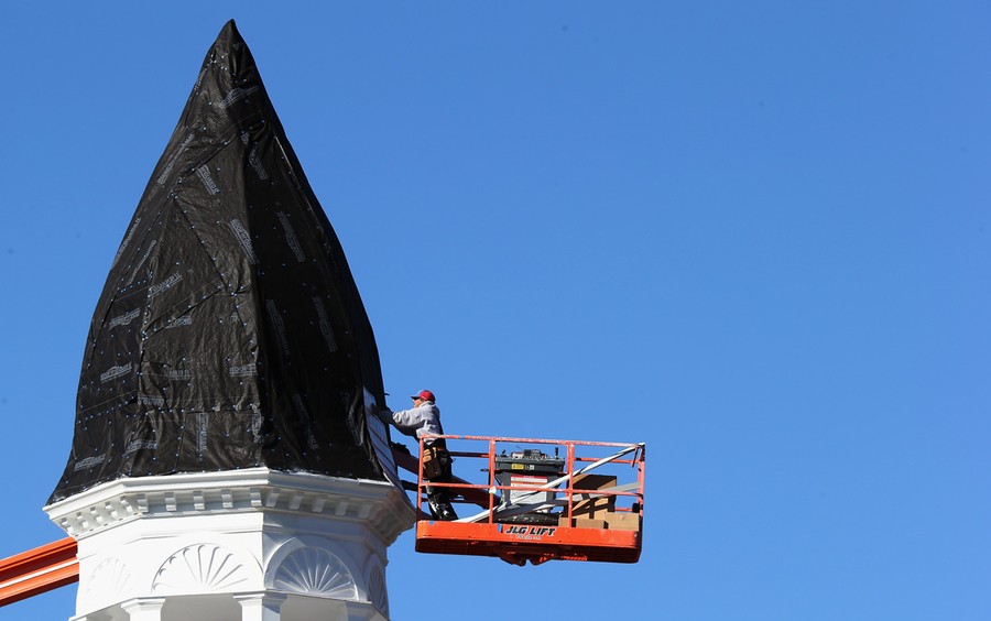 A workman repairs damage to the steeple of the First United Methodist Church in the aftermath of Superstorm Sandy in Port Jefferson, New York, on November 4, 2012.#