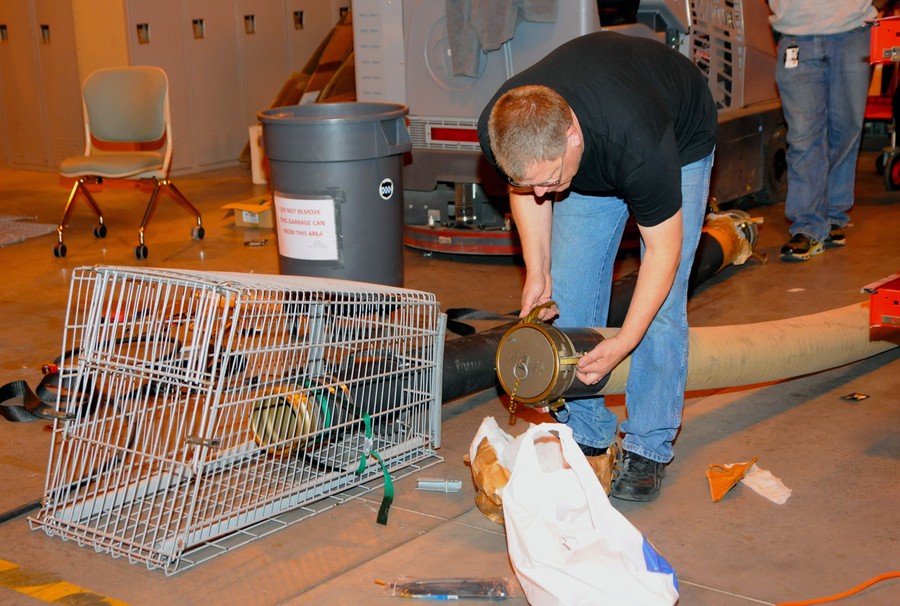 Paul Stetson, a logistics specialist with the 99th Regional Support Command, inspects a hose before connecting it to an improvised cage filter, on November 4 at Fort Dix, New Jersey. Stetson and his team constructed 20 filters from shopping carts donated by the Fort Dix Commissary. The filters and pumps will help remove water from flooded roadways and subways as a result of Hurricane Sandy.#