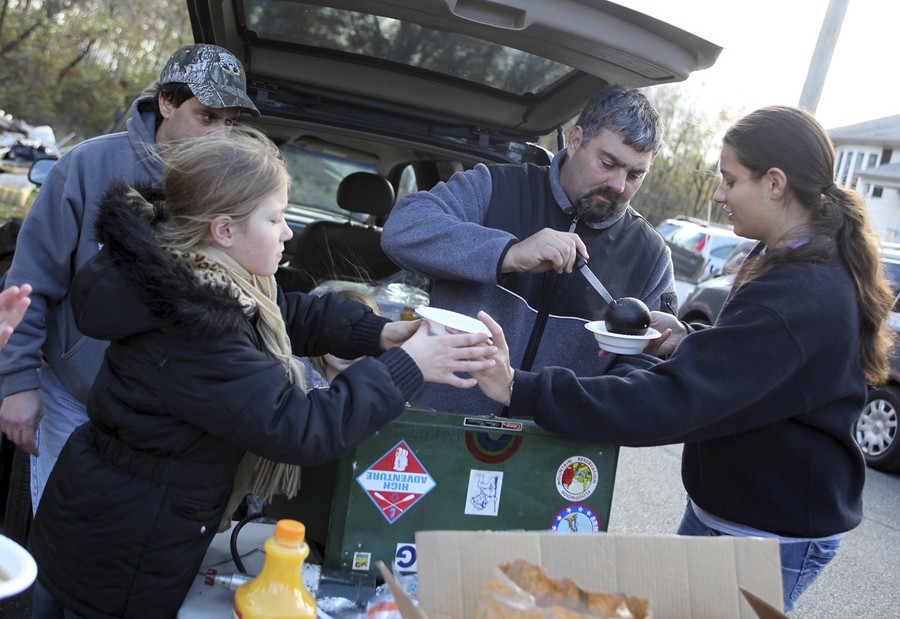 Ed Banek of Hackensack distributes hot soup to Amanda Leo, 10, and Megan Jeffers of Clifton in one of the Hurricane Sandy damaged neighborhoods in Little Ferry, New Jersey, on November 3, 2012.#