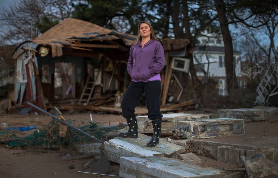 Read moreKim Joyce stands in front of the remains of her home destroyed by Hurricane Sandy on Crescent Beach, Staten Island, on November 14, 2012. Joyce, who owned one of the last remaining beach bungalow style houses on the south shore of the island, had to swim to safety as the storm crashed through her house. She had to leave her pets behind but she returns each day in the hope that one of her nine cats will reappear. So far she has found the bodies of two of them. #