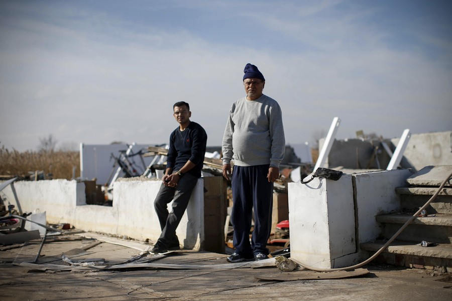 Read moreKulib Abass, a New York City Cab driver, with his son Hassan in the remains of his house on Kissam Avenue, Staten Island, on November 12, 2012. Abass's house was destroyed, along with most of the neighborhood, by Hurricane Sandy. Just three years earlier, neighbors on this tight-knit seaside road had pulled together to survive a devastating Easter 2009 fire that damaged many of their homes. Most are now suddenly homeless like Abbas who said he would likely not return to rebuild on this low-lying part of Staten Island where he had hoped to spend his retirement years living by the shore. #