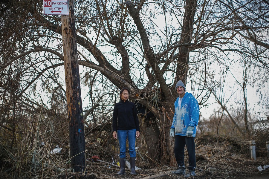 Read moreLisa Perez and her neighbor Edward Perez stand in front of the tree that both were separately swept into by rushing storm surge waters when Hurricane Sandy struck in Oakwood Beach, Staten Island, on November 14, 2012. Lisa, who lives in a single-story home raised eight feet above the ground, was swept into the water when she tried to move her car to higher ground, said, "I felt myself drowning and was screaming to my daughter, if I die, just stay there!" At the same moment, neighbor Eddie Perez was also swept into the water trying to escape his home. Eddie yelled at Lisa, now holding on to a log to "go for the tree." The two climbed onto the tree where they spent close to two hours at the height of the storm unable to move. #