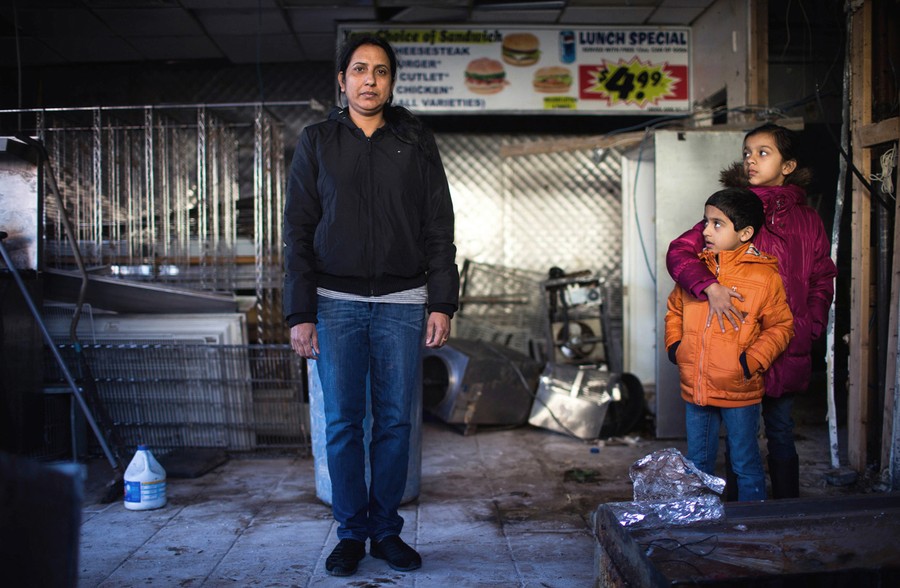 Read moreJaswinder Kaur, with her two children Taranjot, 9, and Harshjot, 5, in the remains of their convenience and deli store which was destroyed by Hurricane Sandy in New Dorp Beach, Staten Island, on November 14, 2012. Jaswinder, a single mother, faces an uncertain future as the building that she rented may need to be torn down. #
