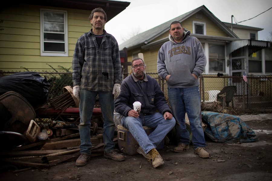 Read moreFrom left, Joseph Ciavardone, Bobby Rasmussen, and Carlo Loporto, who have been friends and neighbors since they where children living in New Dorp Beach, Staten Island, take a break from gutting out the flooded remains of Ciavardone's home on November 14, 2012. All three men had their homes completely flooded when Hurricane Sandy hit but they plan to stay in the area where they were born and raised. #