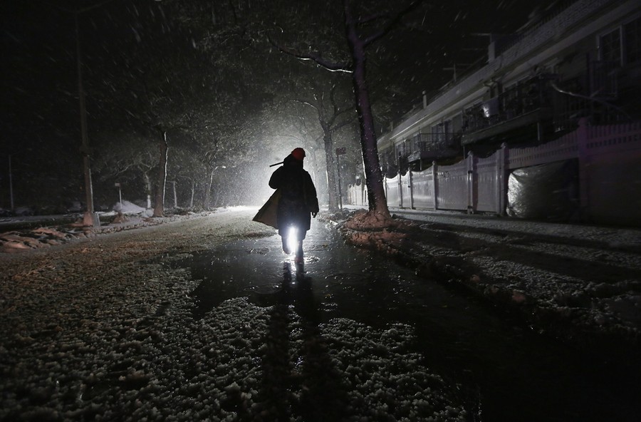 Read moreA repair worker is silhouetted by a police spotlight as he walks down a darkened street during a nor'easter snowstorm in the Rockaway neighborhood of Queens, on November 7, 2012. #