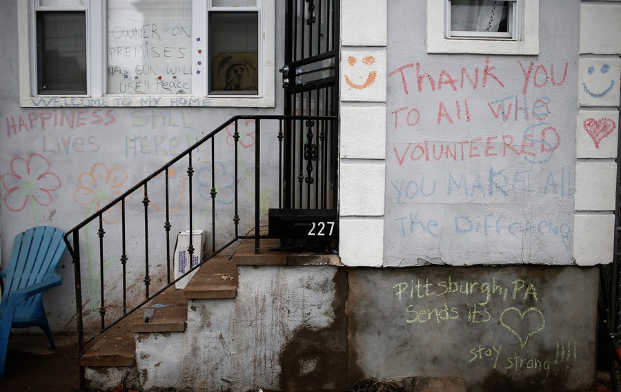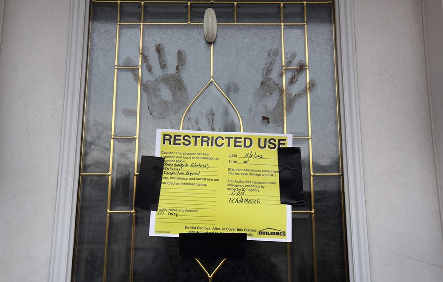 Read moreMuddy handprints mark the front door of a home that was heavily damaged by Sandy, on November 13, 2012 in New York City. More than two weeks after the devastating storm, Staten Island continues to recover. #