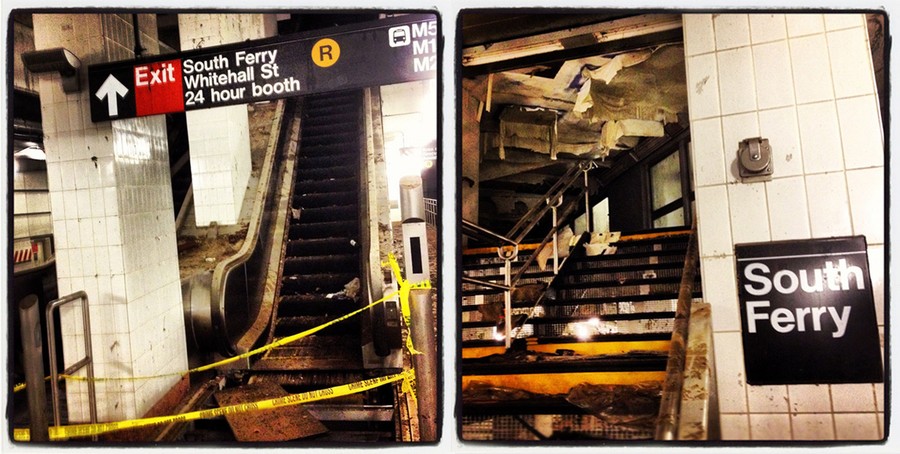 Read moreExamples of the damage sustained by the South Ferry station on the New York City Subway's 1 Line. The station was flooded during Hurricane Sandy. These are a water-logged, damaged escalator and stairwell leading to the platform. #
