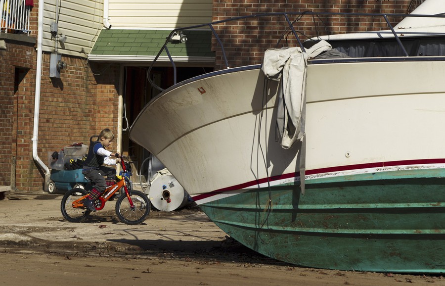 Read moreA boy rides his bike in front of a boat that became lodged on shore by the storm surge of Hurricane Sandy in the Annadale neighborhood of Staten Island, on November 12, 2012. #