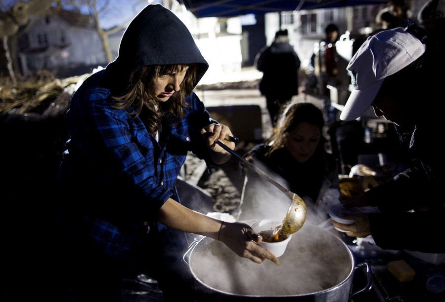 Read moreAriel Nadelberg of Brooklyn pours hot soup in a cup at a parking lot that has become a makeshift station where those in need can get food and clothing in a Rockaway neighborhood of Queens, on November 5, 2012. #