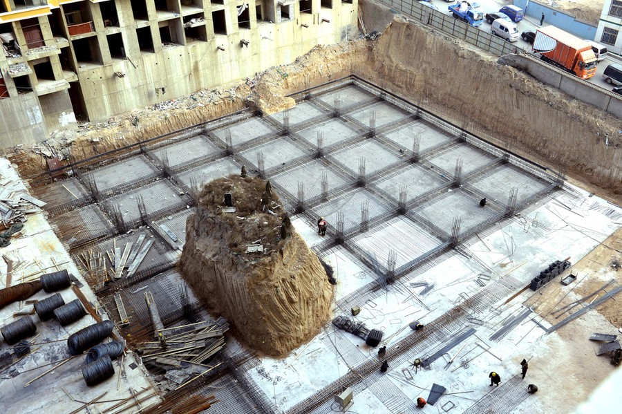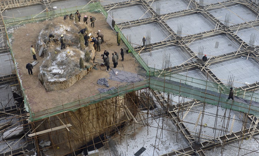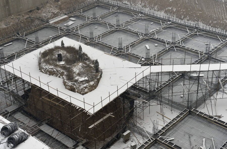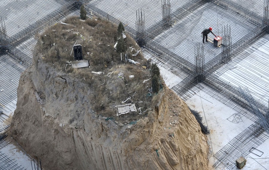 In Taiyuan, in northern China's Shanxi province, construction began on a new high-end residential compound last year. When developers needed to excavate a cemetery for the building's foundation, they offered to pay villagers to relocate the remains of loved ones. One family refused to budge, complaining that the compensation was too low. In China, such disputed plots are typically known as "nail houses," and developers continue to build around them while the issue is resolved. In this case, workers carved out a "nail grave" belonging to the family of Chang Jinzhu. The small, bizarre column stood 10 meters above the foundation floor for months. This week, it was reported that Jinzhu's family had reached an agreement with the construction consortium, receiving 800 Yuan ($128 USD) in compensation. A platform and bridge to the gravesite were built, and the family had the four coffins and gravestones removed.