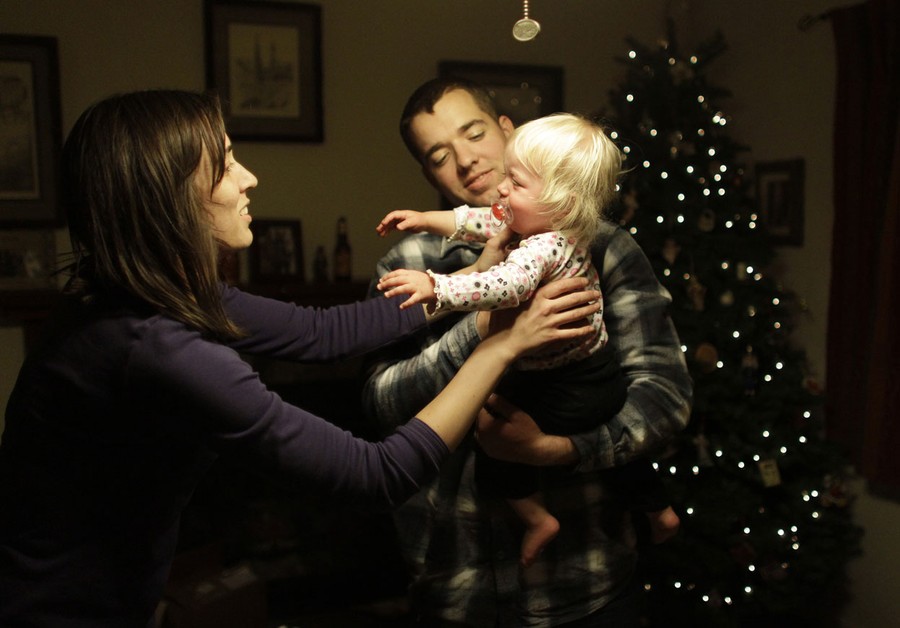 Read moreA newly-decorated Christmas tree lit behind him, U.S. Army 1st Lt. Aaron Dunn hands his baby Emma to his wife Leanne, in their living room in Fountain, Colorado, one week after Dunn's return from a tour of duty in Afghanistan, on December 8, 2012. 1st Lt. Dunn had not seen his wife and baby since his unit deployed to the mountains of Afghanistan in February. #