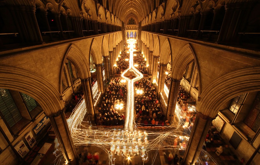 Read moreIn this combination of two images the interior of Salisbury Cathedral is illuminated by trails of candles carried by choristers during the annual "darkness to light" advent procession on December 1, 2012 in Salisbury, England. The service -- which begins with the medieval cathedral in total darkness and silence before the Advent Candle is lit at the West End -- is one of the most popular services of the liturgical year. The annual advent service, which takes place over three nights and is seen by several thousand people, is a mix of music and readings during which two great candlelit processions move around the different spaces in the 750-year-old building which, by the end, is illuminated by almost 1,300 candles. #