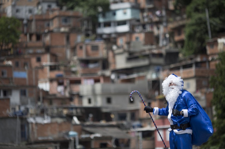 Read moreA police officer dressed in a blue Santa Claus costume holds a sack and cane in the Macacos slum after arriving by police helicopter in Rio de Janeiro, Brazil, on December 20, 2012. The Pacifying Police Unit, or UPP, organized for Santa to visit the slum to hand out Christmas gifts to young residents. #