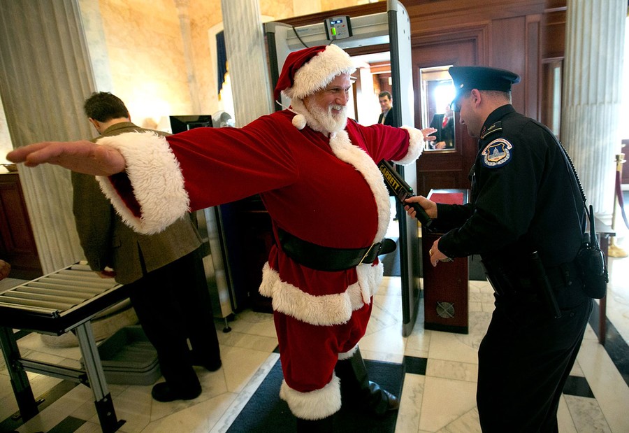 Read moreCapitol Hill police check an unidentified man dressed as Santa Claus with a metal detector as he enters the U.S. Capitol on his way to Speaker of the House John Boehner's office in Washington, DC, on December 12, 2012. The man was working with the group Catholics United, and wanted to urge Speaker of the House John Boehner to pass pending "fiscal cliff" legislation before Christmas. #