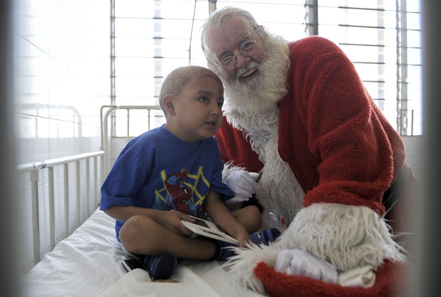 Read moreIcelandic philanthropist Einar Sveinsson, dressed as Santa Claus, speaks with a patient at the oncology ward during a visit to the Benjamin Bloom National Children Hospital, in San Salvador, on December 11, 2012. Sveinsson has visited the hospital prior to Christmas every year since 2001 to give gifts to the patients. #