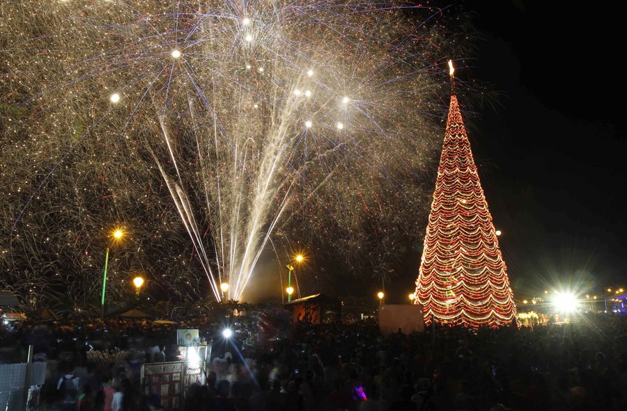 Read moreFireworks light the sky near a giant Christmas tree in Puerto Princesa city, Palawan, west of Manila, on December 1, 2012. The Philippines, a mainly Roman Catholic country, celebrates one of the longest Christmas holidays in the world, playing Christmas carols in shopping malls in September and putting up lanterns and fireworks early in December. #