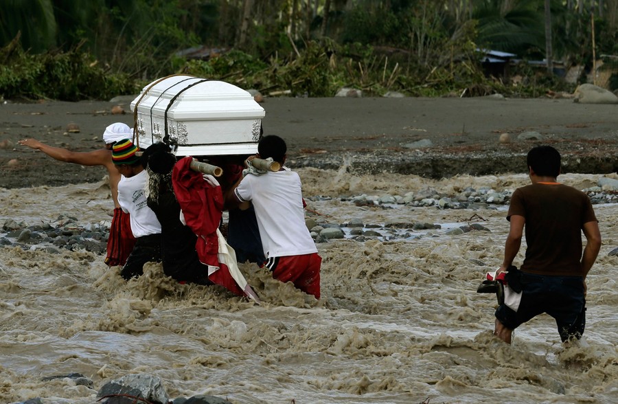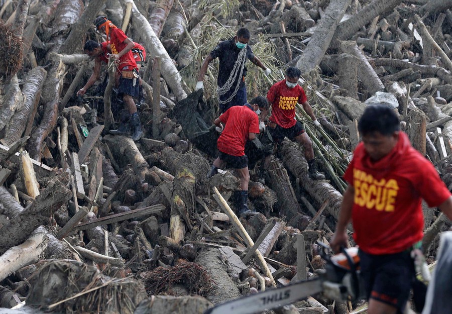 Last week, the southern Philippines was struck by Typhoon Bopha, the strongest tropical cyclone to ever hit the island of Mindanao. Bopha made landfall as a Category 5 super typhoon with winds of 160 mph (260 km/h), flattening coastal villages, wiping out banana plantations, and causing mudslides and flooding. At the moment, the number of deaths has reached nearly 650, the number of missing is still near 800, and another 400,000 have been displaced by the storm. Collected here are images from the affected islands, as rescue and recovery workers continue to search through debris in fields choked with trees, boulders, and mud.