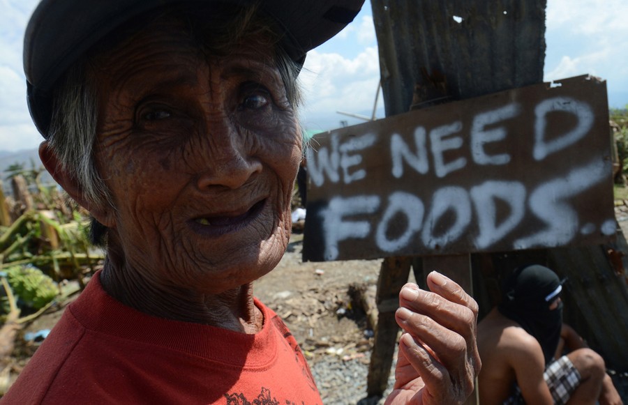 Read moreAn elderly woman, a victim of the devastating Typhoon, begs for alms next to a sign displayed along the roadside in the town of Nabunturan Town, on December 9, 2012. Desperate families begged for food days after the typhoon brought death and destruction to parts of a southern Philippine island. #
