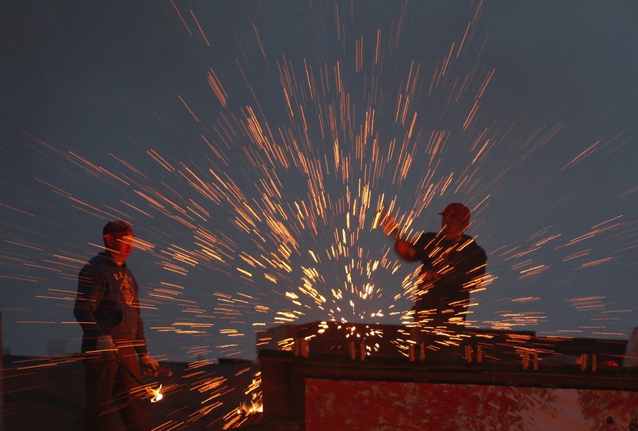 Read moreA man throws molten iron while dancers perform a dragon dance in the shower of molten iron spewing firework-like sparks, during a folk art performance to celebrate traditional Chinese Spring Festival at an amusement park in Beijing, on February 10, 2013. #