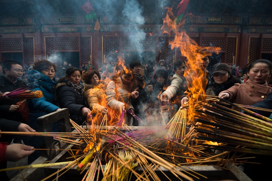 Read moreAn Indonesian man of Chinese descent holds up a bottle of oil as an offering as he and others pray in the smoke filled Vihara Dharma Bhakti temple on the first day of the Chinese Lunar New year, February 10, 2013 in Jakarta, Indonesia. #