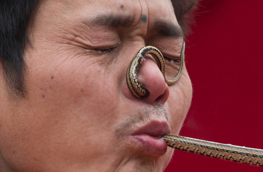 Read moreA performer passes a snake through his nose and out his mouth during a show at a fair as part of lunar new year festivities at the Temple of Earth park in Beijing, on February 11, 2013. A billion-plus Asians ushered in the lunar Year of the Snake with a week of festivities. #