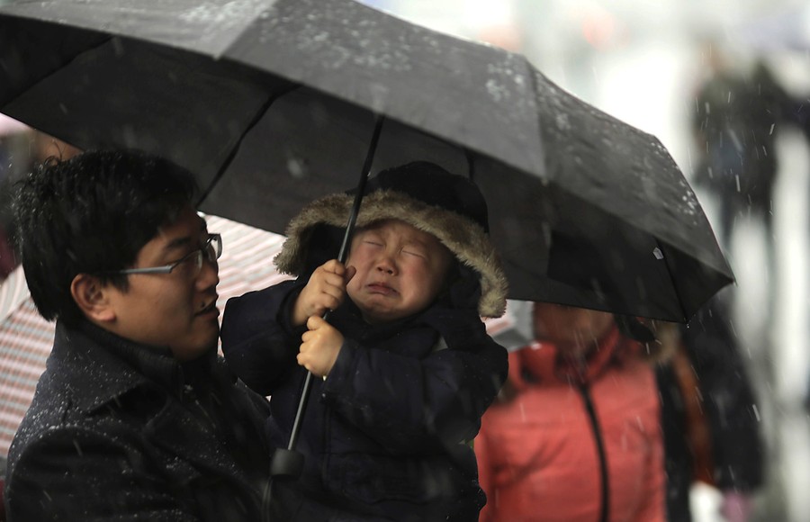 Read moreA child held by his father cries as he holds an umbrella in the snow at the Shanghai Railway Station, on February 8, 2013 in Shanghai. Millions of Chinese are expected to cram onto China's train network in the coming weeks to return home for the Chinese Lunar New Year. #
