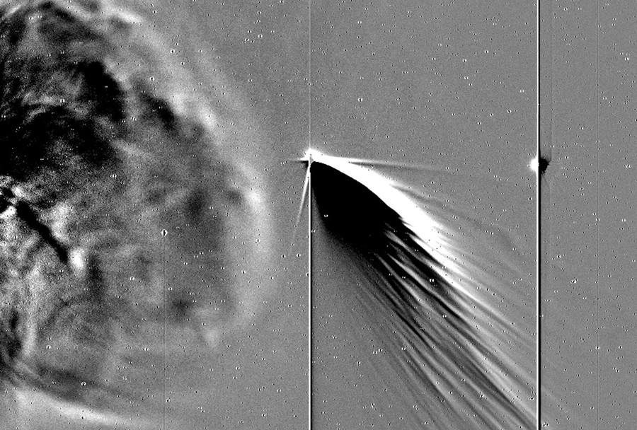 Read moreComet Pan-STARRS, seen from the STEREO Behind spacecraft, on March 15, 2013. At right is the Earth, at left, a coronal mass ejection (CME) flying outward from the Sun. Following in Earth's orbit, the spacecraft is nearly opposite the Sun and looks back toward the comet and Earth, with the Sun just off the left side of the frame. The comet is in the foreground of this image. Objects that are too bright create the sharp vertical lines. The image reveals complex feather-like structures in Comet Pan-STARRS caused by dust particles. The ion tail is the thin one that's pointing almost radially away from the Sun. #
