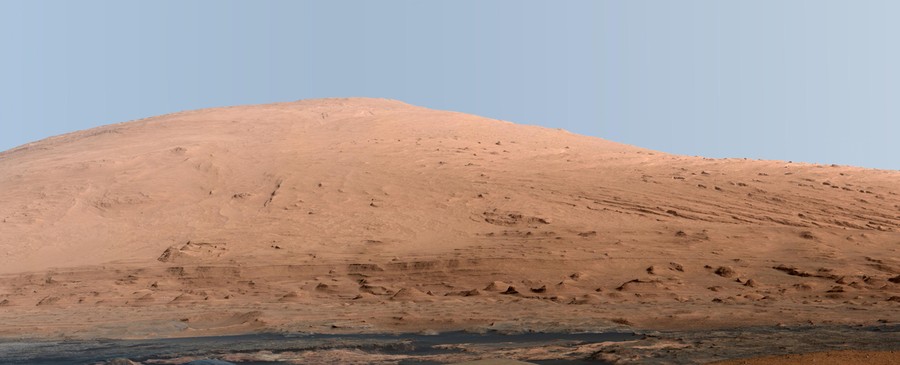 Read moreThis mosaic of images from the Mast Camera (Mastcam) on NASA's Mars rover Curiosity shows Mount Sharp in a white-balanced color adjustment that makes the sky look overly blue but shows the terrain as if under Earth-like lighting. Mount Sharp, also called Aeolis Mons, is a layered mound in the center of Mars' Gale Crater, rising more than 3 miles (5 kilometers) above the crater floor, where Curiosity has been working since the rover's landing in August 2012. Lower slopes of Mount Sharp are the major destination for the mission, though the rover will first spend many more weeks around a location called "Yellowknife Bay," where it has found evidence of a past environment favorable for microbial life. Images gathered on September 20, 2012. #