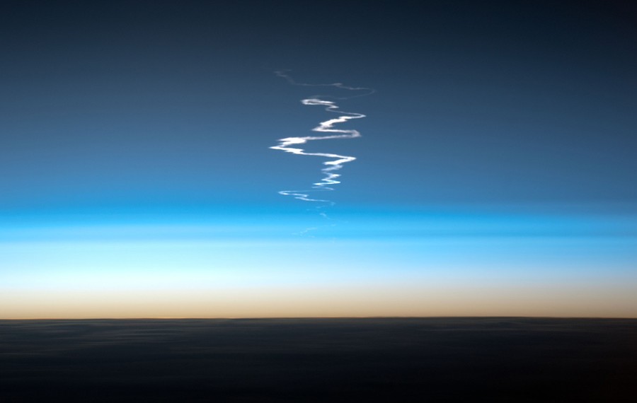 Read moreLayers of atmosphere along Earth's limb and the exhaust trails from a Soyuz rocket that lifted off from Baikonur Cosmodrome in Kazakhstan on October 23, 2012. At the time, the ISS was passing over northeastern China, and the photographer was looking back to the west. The plumes bent and curled in different directions, most likely due to winds blowing in different directions as the spacecraft made its way both horizontally across the sky and vertically through several atmospheric layers. The Soyuz passed through the troposphere, the stratosphere, the mesosphere, and into the thermosphere. Rocket trails can last for minutes to hours and reside high enough in the atmosphere that they will often remain lit well after the Sun is below the horizon. #