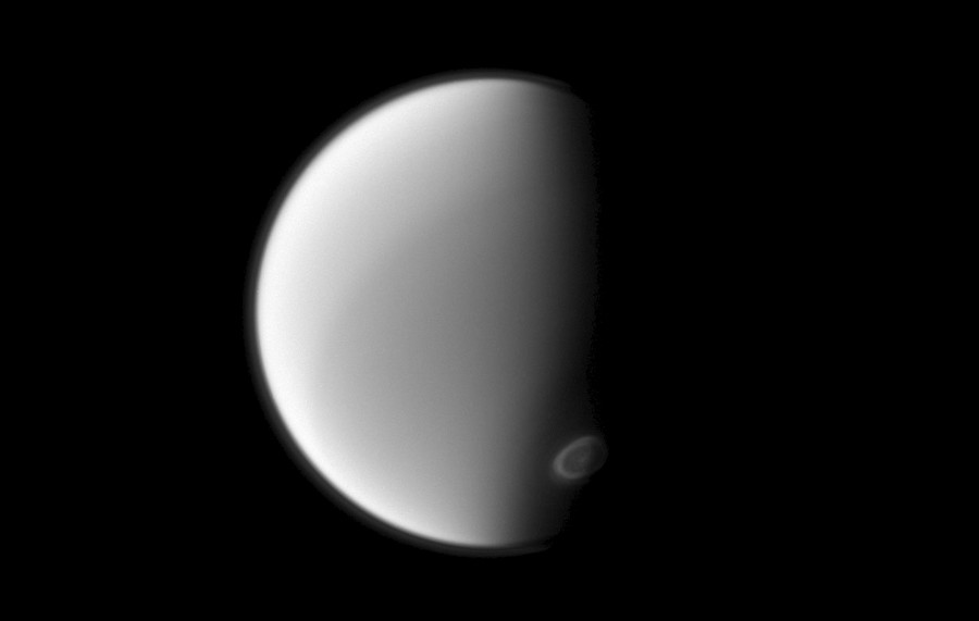 Read moreNASA's Cassini orbiter spies Titan's south polar vortex from below the moon in this September 13, 2012 image, while in orbit around Saturn. Imaging scientists are monitoring the vortex to study its seasonal development. #