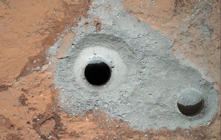 Read moreA fresh drill hole, center, made by the Curiosity rover on Mars, on February 8, 2013 next to an earlier test hole. Curiosity has completed its first drill into a Martian rock, a huge milestone since landing in an ancient crater in August 2012. #