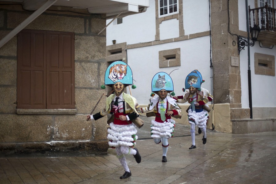Read moreCarnival revelers dressed as "Peliqueiros" run through a street in Spain's northwestern village of Laza, on February 10, 2013. "Peliqueiros" or ancient tax collectors, pursued villagers through the streets ringing their cowbells and hitting villagers with their sticks. #