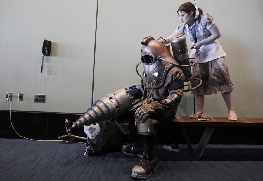 Read moreAly Ilyadias helps Will Patriquin with his costume, both of them dressed as characters from the video game BioShock, at the PAX East gaming convention in Boston, Massachusetts, on March 23, 2013. #