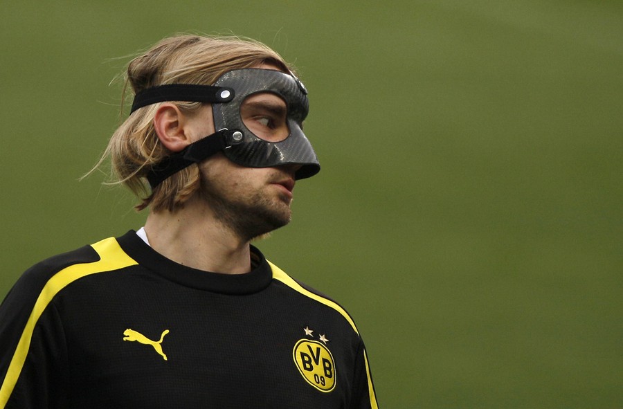 Read moreMarcel Schmelzer of German soccer team Borussia Dortmund wears a protective mask during a training session at La Rosaleda stadium in Malaga, southern Spain, on April 2, 2013. #