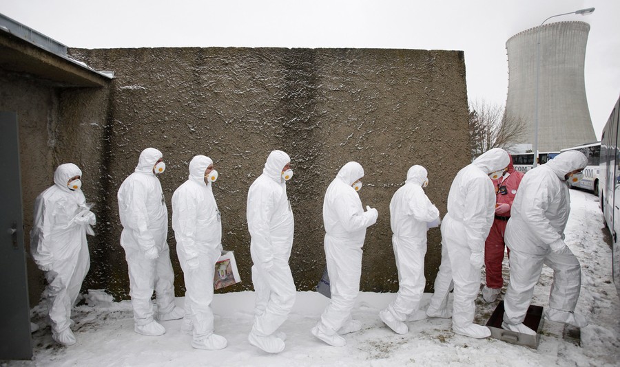 Read moreWorkers wearing protective suits and masks exit a fallout shelter during a nuclear accident simulation as part of a safety regulations exercise at Nuclear Power Plant Dukovany in Dukovany, Czech Republic, on March 26, 2013. #