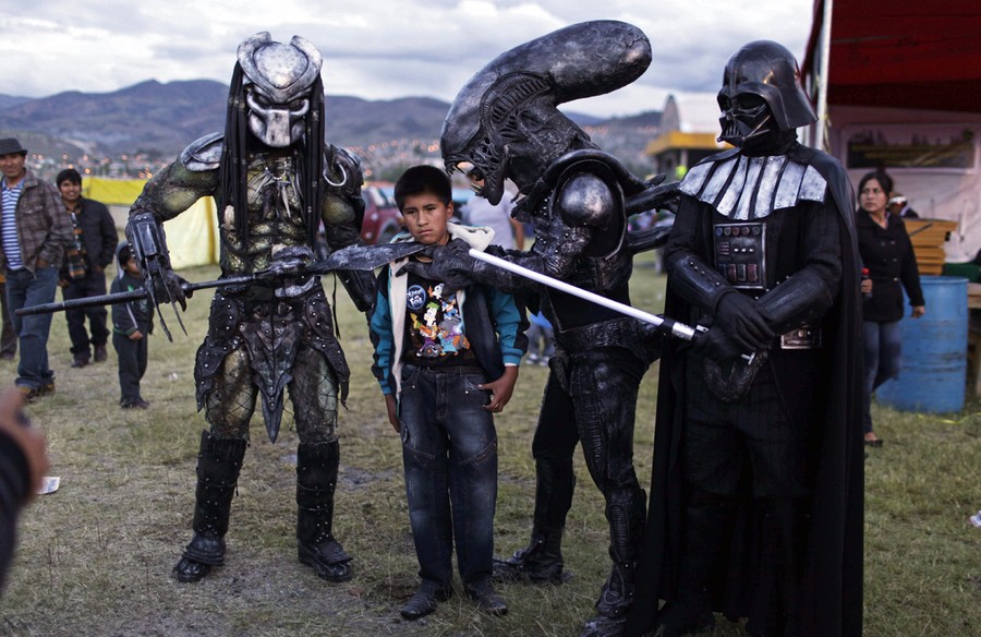Read moreA boy poses for a picture with people wearing costumes of famous sci-fi movies during the Canaan fair which is part of the Holy Week celebrations in Ayacucho, Peru, on March 28, 2013. #