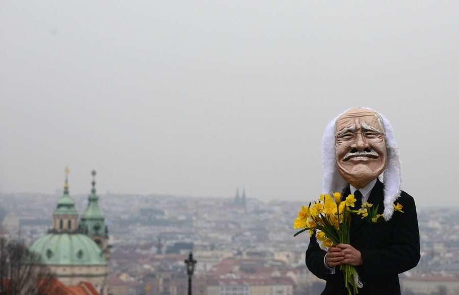 Read moreA man wearing a mask of Czech President Vaclav Klaus holds flowers during a march celebrating the end of his presidency, on March 7, 2013 at the Charles Bridge in Prague. #