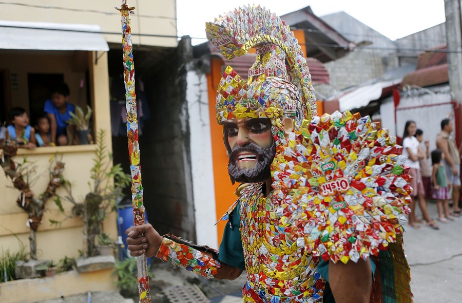 Read moreA penitent in a costume made of candy wrappers takes part in a procession for the Moriones Festival during Holy Week in Mogpog town on Marinduque island, central Philippines, on March 27, 2013. During the festival, masked and costumed penitents called "Moriones" dress in attire that is the local interpretation of what Roman soldiers wore during biblical times. #
