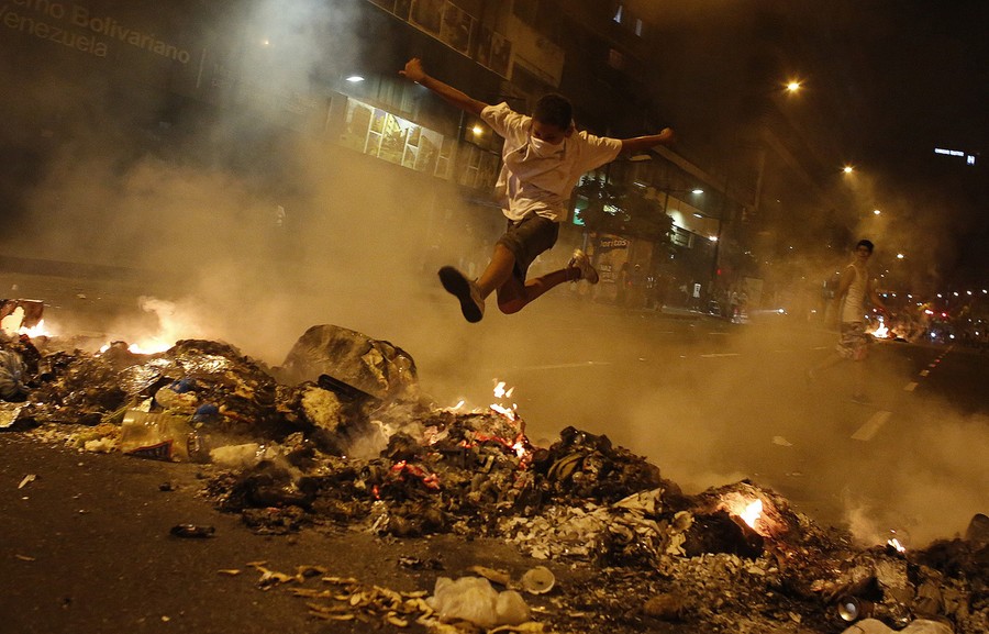 Read moreA boy jumps over a barricade of burning garbage that supporters of Henrique Capriles used to block a street, as they demonstrated for a recount of the votes in Sunday's election, in Caracas, on April 15, 2013. Hundreds of protesters clashed with police in the Venezuelan capital on Monday after Capriles called for demonstrations to demand a recount of votes from Sunday's election to replace the late Hugo Chavez. #